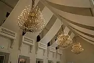 During World War II, the palace complex was reduced to a shell by bombs in 1944. It was rebuilt in 195051, the exterior being accurately reconstructed using the original plans and the interior finished in 1950s style, except for a few spaces in the centre section whose interiors were reconstructed in the classical style of the palace's original construction (before Stüler's alterations): the grand staircase, the entrance hall, the guard room (now known as the Spiegelsaal (hall of mirrors) or the Kurfürstensaal (elector's hall) and the garden room.[1] A competition was held to choose art works for these rooms: the staircase was decorated on the ground floor with a statue by Emil Krieger entitled Kore, on the landings with Europa on the Bull by Otto Rumpf and Horse and Rider by Werner Meurer and on the first floor with niche paintings by Edvard Frank; Rolf Müller-Landau created allegorical paintings for the niches in the south hall on the ground floor; two paintings in the northern vestibule of the garden room are by Edgar Ehse; and a mosaic on one wall of the grand staircase, signed E. K., is probably by Eugen Keller. The selection committee attempted to reproduce as closely as possible the original impression a visitor would have received, including in the choice of colours, but the works reflect the period of their creation.[8] The grounds were restored in the original style, in particular the forecourt. The only surviving historic interior is that of the vestibule to the now destroyed palace chapel, at the head end of the northern semi-circular wing. The two wings were restored in a simplified modern form, preserving only the footprint of the originals.[1]