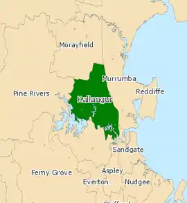 The district was based in the outer northern suburbs of Brisbane. It is named for the suburb of Kallangur and also includes the suburbs of Dakabin, Kurwongbah, Murrumba Downs, Petrie and part of Narangba. The electorate was first contested in 1992.