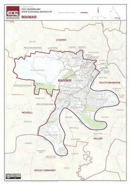 Maiwar is an electoral district of the Legislative Assembly in the Australian state of Queensland, incorporating the inner western suburbs of Brisbane. It was created in the 2017 redistribution, and was first contested at the 2017 Queensland state election. The name of the electorate is stated by the government as being based on an Aboriginal name for the Brisbane River, however it is not the name that the Turrbal people who lived in the Brisbane region had for the river.[1] The Brisbane River forms the southern boundary of the electorate.[2]