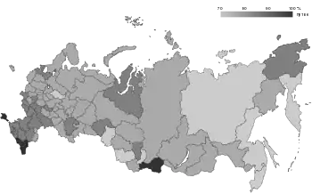 2000 election. Blue indicates a win by Putin, red a win by Zyuganov, grey a win by Tuleyev.