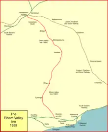 The valley was poorly connected to the nearest market towns, Ashford and Canterbury, with the main road being little more than a dirt track.[2] Landowners and residents saw that they were isolated in the absence of a railway, and proposed an independent scheme for a line.[3] The first prospectus was presented to Parliament in 1865, outlining an "Elham Valley Light Railway Company" which would build a single-line railway starting at Hythe on the coast, running up through the Seabrook valley, through Newington and joining the existing SER and East Kent lines.[1][3] The line was planned as a light railway with a maximum speed of 25 miles per hour (40 km/h). It was authorised by Parliament (as the Elham Valley Railway) on 6 August 1866,[1] but serious financial difficulties plagued the scheme due to the national financial crisis, and the project was cancelled.[4][5] It was abandoned by a Board of Trade Order on 30 August 1873 because of to "failure to raise sufficient capital".[1]