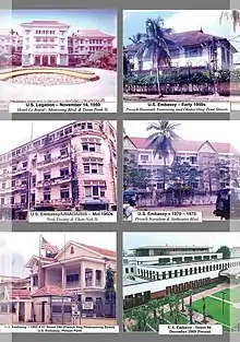 As part of a growing anti-American sentiment in the country, there were two attacks on the embassy in the mid-1960s. The first, in March 1964, caused over $150,000 in damage and led to increased suspicion in US-Cambodia relations. Ambassador Herbert D. Spivack suspected that Prince Sihanouk had purposely orchestrated the incident and a similar event at the British embassy. The second incident in 1965 led to less destruction, with the embassy not being breached, but rocks were thrown through the windows and there were still thousands of dollars of damages incurred.[3] In response to the last attack and alleging that the United States was responsible for recent cross-border air attacks by South Vietnam that had killed Cambodian citizens, Sihanouk announced the severance of relations with the United States in 1965. Although Sihanouk still wished to maintain a consulate in the country to facilitate tourism in order to preserve the foreign currency inflow that it brought, a lack of assurances about maintaining an uninterrupted transition from the Cambodian side led to the US pulling out entirely.[4][5] During this break in relations, Australia represented the United States in Phnom Penh.[6] With the further penetration of Vietnamese communist forces into Cambodia, Sihanouk was anxious to restore relations, and the US Embassy reopened on August 16, 1969.[7] During the fall of Phnom Penh to the Khmer Rouge in 1975, the US government evacuated embassy personnel in Operation Eagle Pull, which has been seen as a predecessor to the evacuation of the embassy in Saigon the same year.[8] The French embassy was still staffed after the takeover and temporarily hosted foreigners as well as Cambodian refugees.[9][10] Relations were then suspended between 1975 and 1990 under the Khmer Rouge-led Democratic Kampuchea and later the People's Republic of Kampuchea.[4]