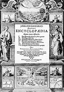 Johann Heinrich Alsted published the Encyclopaedia in seven volumes in 1620[1] in Herborn. It is often argued that this is the first work to bear the title "encyclopedia", though Joachim Sterck van Ringelbergh's Lucubrationes vel potius absolutissima kyklopaideia was published in 1538, and Paul Scalich published Encyclopediae seu orbis disciplinarum tam sacrarum quam profanarum epistemon in 1559.