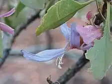 The flowers are borne singly in leaf axils from which they hang on a glabrous stalk 30–45 mm (1–2 in) long. There are 5 overlapping, reddish-purple, egg-shaped sepals which differ in size from each other, the longest ones 24–31 mm (0.94–1.2 in) while the shortest is 15–25 mm (0.59–0.98 in) long. The outer surface of the sepals is hairy and the inner surface glabrous. The petals are 40–50 mm (1.6–2.0 in) long and joined at their lower end to form a tube. The tube is brown but the petal lobes on its end purplish-blue and up to 20 mm (0.8 in) long, with two of the lobes spreading like rabbits' ears. The outer surface of the tube and both sides of the lobes are covered with short hairs and the inside of the tube is full of long, soft hairs. The 4 stamens extend beyond the end of the petal tube. Flowering occurs from June to September and is followed by fruits which are dry, oval shaped with a pointed end and 6–9 mm (0.24–0.35 in) long.[2][3]