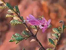 Eremophila purpurascens is an erect shrub with many tangled branches. It grows to a height of up to 1.5 m (5 ft). Many of its branches arise from ground level and the leaves smell like camphor when crushed. The branches have persistent raised leaf bases, prominent glands and are glabrous and often sticky due to the presence of resin. The leaves are often all clustered at the ends of the branches and are thick, fleshy, egg-shaped to spoon-shaped, mostly 7.5–12 mm (0.3–0.5 in) long, 3–6 mm (0.1–0.2 in) wide, often sticky and have prominent raised, warty glands.[2][3][4]