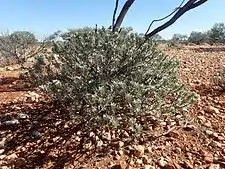 Eremophila spathulata is a shrub with many tangled branches and which grows to a height of between 0.6 and 1.0 m (2 and 3 ft). It branches and leaves are covered with a layer of tangled, silvery-grey hairs which are pressed against the surface. The leaves are thick, stiff and egg-shaped, spoon-shaped or lance-shaped, mostly 17–30 mm (0.7–1 in) long and 6–14 mm (0.2–0.6 in) wide.[2][3]