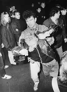 In a 1931 biography written for the Cadre Division of the Comintern,[20] Mielke recalled, "We took care of all kinds of work: terror acts, protecting illegal demonstrations and meetings, arms-trafficking, etc. The last work, which was accomplished by a Comrade and myself, was the Bülowplatz Affair" (German: "Wir erledigten hier alle möglichen Arbeiten, Terrorakte, Schutz illegaler Demonstrationen und Versammlungen, Waffentransport und reinigung usw. Als letzte Arbeit erledigten ein Genosse und ich die Bülowplatzsache.").[21]