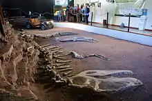 The paleontological exhibition has reconstructions and original fossils of different extinct species. There is a reconstruction mounted on the articulated skeleton, and original remains of Giganotosaurus carolinii. Mounted reconstructions of Neuquensaurus australis and Amargasaurus cazaui, and a cast of the head and neck of Bajadasaurus pronuspinax are also exhibited. Besides, there are a replica of a vertebra of Argentinosaurus huinculensis and the original femur of an unspecified titanosaur. Moreover, there is a replica of the mounted skeleton of Carnotaurus sastrei and Skorpiovenator bustingorryi. This last species is exhibited in the same way as it was found at the excavation site. Apart from the species Carnotaurus, there are original caudal and dorsal vertebrae, metarcapus and maxilla of the sauropod Choconsaurus baileywillisi, whose specific name comes from the locality where it was found. In addition to dinosaurs, original materials of Prochelidella sp., Kaikaifilusaurus calvoi and Avitabatrachus uliana, and the replica of Araripesuchus patagonicus are exhibited.[10]