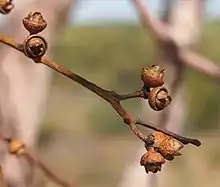 The flower buds are arranged in leaf axils in groups of seven, sometimes up to eleven, on an unbranched peduncle 6–12 mm (0.24–0.47 in) long, the individual buds on pedicels 1–3 mm (0.039–0.118 in) long. Mature buds are oval, 3–7 mm (0.12–0.28 in) long and 3–5 mm (0.12–0.20 in) wide with a rounded, blunt conical or shortly beaked operculum. Flowering occurs between March and August and the flowers are creamy white. The fruit is a woody cup-shaped, barrel-shaped or hemispherical capsule 5–8 mm (0.20–0.31 in) long and 4–6 mm (0.16–0.24 in) wide with the valves enclosed below the rim or prominently protruding, depending on subspecies. The seeds are yellow-brown and round or elliptical.[2][4][6][7][8]