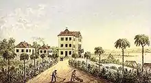 Eugénie then sold Schloss Eugensberg for 32,000 guilders to Heinrich von Kiesow of Augsburg.[1] The proceeds of that sale financed her rebuilding of Villa Eugenia in Hechingen, where the couple took up residence in 1834. At the southern edge of the villa's park, she acquired the Gasthaus Zur Silberburg and in 1844 rebuilt it as another villa, to house visiting noble relations. The surrounding gardens were also bought up and redesigned as an English landscape, now known as the Fürstengarten.
