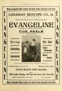 Marguerite Marquis wrote a screenplay based on Henry Wadsworth Longfellow's poem Evangeline which had already been adapted into a film in 1911, and again in 1919 and 1929. The film was produced at a cost of $30,000 (equivalent to $712,369 in 2021). Filming was completed by November 1913, and was done on location in Nova Scotia at Annapolis Royal, Annapolis Valley, Dartmouth, Grand-Pré, Halifax, Port-Royal, and Preston, and in Quebec at Oka and Sainte-Rose. The cinematography was done by Oliver and William C. Thompson. The final film was a black-and-white 35 mm silent five-reel film with a runtime of seventy-five minutes.[1][5]
