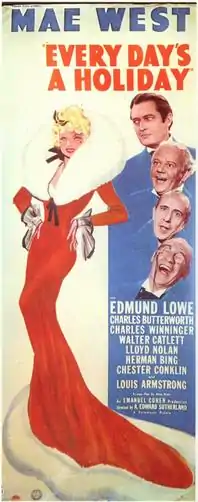 Every Day's a Holiday is a 1937 American comedy film starring and co-written by Mae West, directed by A. Edward Sutherland, and released by Paramount Pictures. The film, released on December 18, 1937, also starred Edmund Lowe, Charles Winninger, and Charles Butterworth. This was West's last film under her Paramount contract, after which she went on to make My Little Chickadee (1940) for Universal Pictures and The Heat's On (1943) for Columbia Pictures.