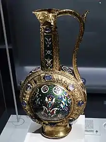 The Ewer of Saint-Maurice d'Agaune is a gold reliquary likely of Byzantine origin found in the treasury of the monastery at Saint-Maurice d'Agaune. Speculation has surrounded its origination and date of creation. The enameled ewer is one of the many treasures found at the Saint-Maurice d'Agaune monastery. The origins of the piece were said to have been seventh century, but until more recently, in 2008, it is argued to have been from the fifth or early sixth century due to the application of the cloisonné.[1]
