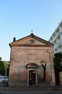 It soon became known as a monument of particular interest and was mentioned by Salvatore Mandruzzato in his Trattato sui Bagni di Abano of 1789, where he listed it among the buildings located on the Montirone hill "...and a church built by the sovereign munificence in 1779 for the benefit of those Catholic patients who contribute to our baths".[2] Sometimes cited as the "Oratorio della Beata Vergine" or "Oratorio del Sacro Cuore", it is nevertheless listed among the protected heritage with the name "Oratorio di San Giovanni".[3] It was used for the rite until the middle of the last century. It is said that blessed Liduina Meneguzzi used to stop here to pray before going to work in the nearby hotel.[4] Due to the expansion of the thermal area after World War II and the inadequacy of the small oratory for the new large number of visitors and inhabitants, plans were made to build a larger church in the immediate vicinity. In 1956 the rite was transferred to the new "Oratorio del Sacro Cuore" while waiting for the construction of the larger and more modern "Sacro Cuore Church", which was completed and opened for worship in 1958.[5] The Oratorio del Montirone was then deconsecrated. It is now privately owned and used as an exhibition space.