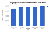 On 24 January 2013, thirteen months into her post of Minister of Employment and Social Security, the number of unemployed in Spain stood at 5,965,400 and the unemployment rate was 26.02%.[10] On 25 April 2013, according to the EPA (Spanish Labour Force Survey), the number of unemployed workers in Spain was 6,202,700 and the unemployment rate was 27.16% of the employable population.[11] Her reforms are widely credited with helping reduce unemployment, which stood at 18.9% in later 2016, still the second highest rate in the European Union after Greece.[12]