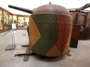 The armament of the Fahrpanzer consisted of one quick-fire gun ranging in size from 37–65 mm (1.5–2.6 in) with the most common sizes being 3.7 cm, 5.3 cm, and 5.7 cm. The Fahrpanzer's guns were capable of +10 degrees and -10 degrees elevation, mounted in a 360-degree rotating turret. The shells were fed from inside by the two-man gun crew, who would be fully protected by the Fahrpanzer's armor until it ran out of ammunition. In practice the firing of the gun destabilized the Fahrpanzer badly, reducing the accuracy of the crew's aim. Since the Fahrpanzer had limited elevation it was a direct fire anti-personnel weapon meant to fire on infantry assaults in the open and the most common types of shells were common, canister and shrapnel.[4] In addition to the Fahrpanzer the Germans also used the 5.3 cm gun in retractable Gruson Works turrets designated the 5 cm SchnellFeuer Kanone in Panzerlafette and a version on a wheeled pedestal mount designated the 5 cm SchnellFeuer Kanone in Kasemattenlafette for use in armored casemates in German frontier fortifications.[5]