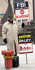 In 2006, Khoiee-Abbasi began standing near the northwest corner of Daley Plaza outside of Chicago City Hall, holding a sign that read "FBI Agent Chris Saviano, stop raping my wife!"[1] Soon, he added other signs to his board, most of which denounce former Chicago Mayor Richard M. Daley, former U.S. Attorney General Alberto Gonzales,[3] and George W. Bush. He stands outside of city hall every weekday, from about 6:00am until about 3:00pm. He has also been photographed holding his signs on Capitol Hill in Washington D.C., and in New York's Times Square.