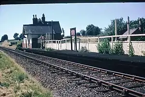 Farthinghoe station was situated on the busiest section of the line, the 5+12-mile (8.9 km) stretch from Merton Street to Cockley Brake, where there was a junction with the Stratford-upon-Avon and Midland Junction Railway (SMJ).[8] Opened on 1 June 1872, the section provided connections to Towcester and Blisworth.[9] The LNWR and SMJ jointly served Farthinghoe and Merton Street until they were absorbed into the London, Midland and Scottish Railway on 1 January 1923 upon the railway grouping. The station lost its stationmaster from 1930 and came under the control of Banbury, only 3½ miles away.[10] Former SMJ passenger services were withdrawn as from 2 July 1951.[9] Farthinghoe was itself to close to passengers the following year.[11]