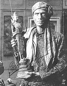 ![]() A shot of Conrad Veidt as the Indian priest holding the sacred statue | |