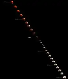 The Moon entered the penumbral shadow at 0:36 UTC, and the umbral shadow at 1:43. Totality lasted for 50 minutes, between 3:01 and 3:51. The Moon left the umbra shadow at 5:09 and left the penumbra shadow at 6:16.[5]