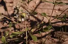 Felicia bergeriana is an annual, moderately sturdy, upright herbaceous plant of up to 25 cm (10 in) high that branches regularly towards the top. Its stems are covered in perpendicular bristles and glands. The leaves are all oppositely arranged on the stems, lance-, ellipse-, spoon- or inverted lance-shaped, up to 312 cm (1.4 in) long and 0.6–1 cm (0.24–0.39 in) wide, entire or with some short teeth, without or with an indistinct stalk and covered in long hairs.[3]