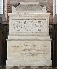 Ferreto also wrote poetry. His priapic verses survive only in fragments.[3] He wrote a poem in 110 lines on the death of Dante Alighieri in 1321, although it appears unfinished.[8] He may have met Dante at the court of Cangrande. He quotes from him and is one of the first who can be shown to have studied Dante's works. He also wrote six poems on the death of the Vicentine poet Campesani in 1323.[5] His major work in verse, however, is Carmen de Scaligerorum origine poema, a poem on the origins of the Scaligeri dedicated to Cangrande I.[9] It was written between Cangrande's takeover of Padua in September 1328 and his death in July 1329.[3] The original poem was in four books, but the surviving version has a fifth book in metrical prose that is not by Ferreto.[5]