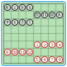 The checkers are placed on the board in a specific pattern.[2]