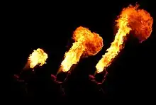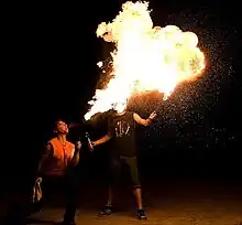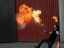The MC Bat Commander, lead singer of the California comedy rock/New Wave/ska band The Aquabats, would regularly breathe fire to start off the band's shows during the late 1990s and early 2000s.[6] Mike Odd, the vocalist for the shock rock/horror metal band Rosemary's Billygoat, included fire breathing in the band's many outlandish stunts, alongside other forms of small-scale pyrotechnics.[7] Zoran Žikić, bass guitarist for the Serbian and Yugoslav hard rock band Kerber, used to perform fire breathing on stage. In 1984, during an open-air concert, he got second degree burns while trying to perform fire breathing under windy conditions. After this incident he was forbidden by the rest of the band members to continue performing the stunt.[8][9]