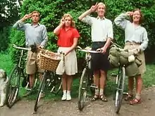 The special mocks and satirises aspects of Blyton's writing, most notably the dated sexism, racism and class snobbery of the Famous Five books (the Five make racist remarks about a porter at the railway station when they are picked up by Aunt Fanny, repeated remarks about Anne as a "proper little housewife") and the formula of the young adventurer genre (most notably kids overhearing criminals discuss their plans, which are portrayed as characters stating "blah blah blah" and key plot elements). There is also a running gag relating to the books' frequent mentions of the various feasts the Five indulge in while picnicking and dining. The film's phrase "lashings of ginger beer" became so well known that it is now often mistakenly attributed to Blyton herself,[1] although it never appears in any of the Famous Five books.[2][3] The film also makes overt references to bestiality in George (implying a sexual relationship of canine cunnilingus between her and Timmy) and overt references to the criminalisation of homosexuality in pre-1968 Britain.