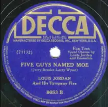 "Five Guys Named Moe" is a song written by Jerry Bresler and Larry Wynn, performed by Louis Jordan and his Tympany Five, recorded in January 1942, and released on the Decca label (catalog no. 8653). The song peaked at No. 3 on Billboard's race record chart and stayed on the chart for 10 weeks.[1]