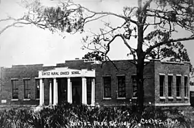 The Cortez Rural Graded Schoolhouse was constructed in 1912 as one of six schools built by Manatee County that year. It replaced an older one-room structure that still stands in the village. Originally three rooms (two classrooms and a principal's office), the school underwent a Federal Works Progress Administration program in 1933 where the middle room, used as a principal's office, was extended into an auditorium with a stage, forming a T-shaped floor plan.[7] The building was used as a school until 1961, when it was leased to an art school. It was ultimately bought in 1974 by Robert Sailors, a master weaver, who converted the old classrooms and auditorium into his studios and home, respectively. Sailors lived and worked in the building until his passing in 1995.[8] In 1999, Manatee County purchased the property and carefully restored the building. In 2007, it was reopened as the Florida Maritime Museum. The Cortez Schoolhouse is listed on the National Register of Historic Places as part of the Cortez Historic District.