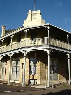 The pub is a heritage-listed, two storey sandstone corner building and timber verandah with posts to the footpath.[3]