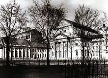 The synagogue building consisted of a three-aisled structure that offered space for 2,000 people. It was built as a pillar basilica, with the facade facing the Landwehr Canal structured with windows in the upper storey. As an architectural style, Beer chose a neoclassical style with elements from medieval and baroque buildings; a large portico with four Greek columns represented the dominant three-part entrance area.[6]