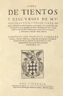 Correa de Araujo was born in Seville. Like most Spanish organists from this era, details of his life are clouded by obscurity. For some time even the years of his birth and death were disputed.[1] His musical background is unclear; he claimed to have learned theory by studying the works of Francisco de Peraza and Diego del Castillo. In 1599 he received an organ appointment in Seville, but became embroiled in a lawsuit with rival Juan Picafort, which delayed confirmation of this appointment for six years. In 1608, he was ordained as a priest. He maintained the post at Seville until 1636. Several times he applied unsuccessfully for other positions, and once again in 1630, he became embroiled in lawsuits which culminated in a brief period of imprisonment. In 1636, he left Seville and took up a post at Jaén Cathedral. In 1640, he was appointed as a prebendary at Segovia Cathedral, and remained there for the last fourteen years of his life. He died in Segovia in abject poverty.