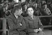 ![]() Strasser (left) listens to his court-appointed interpreter, U.S. Sergeant Sessler (right), during his trial | |
