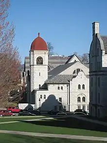 At Williams College, he donated a clock tower to Lasell Gymnasium in 1886.[1] He donated the forty-acre Tallmade Farm to Williams College in 1887.[1][25] In June 1888, he gave a challenge gift of $25,000 to construct a $100,000 memorial to Dr. Mark Hopkins, provided alumni donated the balance needed.[26][27] The resulting Mark Hopkins Memorial building contained a library, art gallery, offices, and a room for lectures and recitations.[26][27] In 1891, he offered to build a new library at his own expense.[28] In 1895, he donated $175,000 for the construction of the Thompson Laboratories.[1][25] In 1895, he donated $5,000 toward the construction of a new infirmary.[25] He also supported scholarships, the Thompson Fund for lectures, and the annual Thompson Entertainments.[1][7][9] At the time of his death, he was the most generous donor in the history of Williams College.[29]