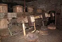 The hammer equipment has been kept fully operational. From the hammer mill pond above the mill a hammer mill channel or ditch leads water to the wooden overshot wheel with a diameter of almost four metres. The octagonal driving shaft is made of oak; it has a weight of about 7 tonnes (15,000 lb) and a length of 9.5 metres (31 ft). Three tilt hammers with heads weighing 250, 200 and 100 kg (550, 440, and 220 lb respectively) are operated by iron tappets on the driving shaft.