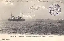 Gloire, named after Glory,[7] was authorized in the 1896 Naval Program and was ordered from the Arsenal de Lorient on 17 September 1898. The ship was laid down on 5 September 1899, launched on 27 June 1900, and completed on 28 April 1904.[8] The cost of her construction was 22,081,725 francs. The ship was assigned as the flagship of Rear Admiral (Contre-amiral) Joseph Bugard, commander of the 1st Cruiser Division (1re Division de croiseurs) of the Northern Squadron. Gloire had been relieved as flagship by 4 August 1905.[9] Together with her sisters Condé and Amiral Aube, Gloire escorted the remains of John Paul Jones from France to Annapolis, Maryland, in April 1906 and then went on to visit New York City.[10] The 2nd Cruiser Division had been formed by January 1907 and Gloire was the division's flagship.[11] On 7–8 August the ship participated in the bombardment of Casablanca, the first step in the French conquest of Morocco.[12] By October 1907 she was the flagship of Rear Admiral Joseph-Alphonse Philibert.[11]