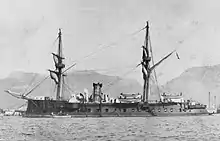 Her main battery consisted of four 240 mm (9.4 in), 19-caliber M1870M guns mounted in individual barbette mounts, two forward placed abreast, and two aft, both of the latter on the centerline. She carried a 194 mm (7.6 in) 19,8-cal. M1870 gun in the bow as a chase gun. These guns were supported by a secondary battery of six 138.6 mm (5.46 in) 21.3-cal. M1870 guns carried in a central battery located amidships in the hull, three guns per broadside. For defense against torpedo boats, she carried twelve 37 mm (1.5 in) 1-pounder Hotchkiss revolver cannon, all in individual mounts. Her armament was rounded out with two 356 mm (14 in) torpedo tubes in above-water launchers forward of the central battery. She also carried a pair of 65 mm (2.6 in) field guns that could be sent ashore with a landing party.[6][5] In 1889, the ship received a pair of 47 mm (1.9 in) guns in place of two of the 37 mm guns, and by 1893, a further four of the 47 mm guns were added.[5]