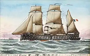 Héroïne (Heroine)[6] was ordered on 16 November 1860 from the Arsenal de Lorient, laid down on 10 June 1861 and launched on 10 December 1863. She was commissioned for trials on 1 April 1864, completed in June 1865,[1] and was definitively commissioned (armement définitif) on the 7th.[2] The ship was assigned to the Ironclad Division (Division cuirassée) of the Northern Squadron, based in Cherbourg.[3] After a visit to Plymouth, England, on 17–19 July by several other French ironclads, the French invited the Channel Fleet to visit Cherbourg on Emperor Napoleon III's birthday in August, to reciprocate British hospitality. They arrived on 14 August and remained for four days, their crews' exchanging ship visits, touring the dockyard and participating in multiple banquets and balls. The British then invited the Ironclad Division and the Mediterranean Squadron (Escadre de la Méditerranée) to visit Portsmouth. The French ships, including Héroïne, arrived later that month and remained until 2 September; their crews similarly occupied as the British were earlier.[7] In September–October 1866 Héroïne, her sisters Magnanime and Flandre and the ironclad Magenta participated in fleet maneuvers and comparative gunnery trials.[8] In 1867 Héroïne was assigned to the Squadron of Evolutions (Escadre d'évolutions) and she became the flagship of Rear Admiral (contre-amiral) Albert Gicquel des Touches in 1868. Two years later she was the flagship of Rear Admiral Bernard Jauréguiberry.[3]