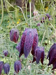 It is a bulb-forming perennial up to 100 cm (39 in) tall. The flowers are pendent, nodding, bell-shaped, brownish-purple with yellowish markings.[3][4]