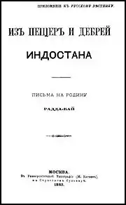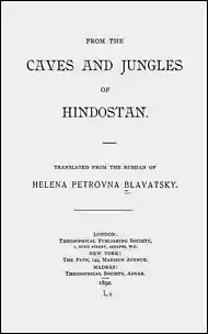 From the Caves and Jungles of Hindostan: Letters to the Homeland (Pre-reform Russian: «Изъ пеще́ръ и де́брей Индоста́на: пи́сьма на ро́дину»; tr. Iz peshcher i debrei Indostana: pis'ma na rodinu) is a literary work by the founder of the Theosophical Society Helena Blavatsky.[note 1] She published it under the pen name Radda Bai in serial installments (letters) from 1879 to 1886 in Moscow in the periodicals Moskovskiya Vedomosti and Russkiy Vestnik, edited by Mikhail Katkov.[2] The first part of these letters was published in a single volume in 1883 as an appendix to the journal Russkiy Vestnik.[3][note 2] The second part of the letters was published in 1884–1886.[5] The series obviously was never finished as it broke off rather suddenly.[note 3]