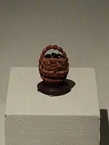 Fruit pit carving (Chinese: 核雕; pinyin: hédiāo) is a Chinese folk handicraft in which the pits of peach, apricot, walnut, Chinese olive, yumberry and other drupes are used to create minute patterns of the Buddha, nature, or the Chinese zodiac[1] that are said to repel evil spirits. The carved pits are also used to create jewelry and decorations.[2] However, the art is now facing extinction because few black olive trees are planted in China and there are very few people interested in learning this art. Olive core carving has recently been recognized as an Intangible Cultural Heritage of the Guangdong Province of China.[3]