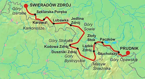 | Trailheads | Świeradów-Zdrój 50°54′30″N 15°20′00″E / 50.908333°N 15.333333°E Prudnik 50°19′11″N 17°34′45″E / 50.319722°N 17.579167°E |