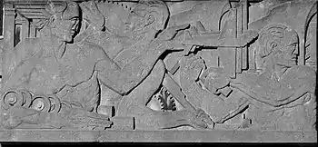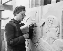 ![]() Hayes in 1942 working on a relief for the façade of the new Department of Industry and Commerce building Kildare Street, Dublin. | |