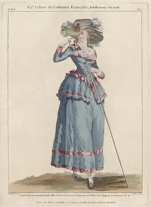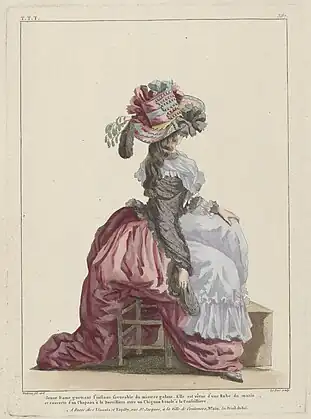 Galerie des Modes et Costumes Français is a series of fashion and costume plates that was distributed in Paris from 1778 to 1787, during the reign of King Louis XVI of France and Marie Antoinette. The first collected volume, which was produced in 1779, had a title page which bore an allegorical illustration as well as the full title of the collection: Gallerie des modes et des costumes français dessinés d'après nature, Gravés par le plus Célèbres Artistes en ce genre, et colorés avec le plus grand soin par Madame Le Beau. Ouvrage commence en l'année 1778. A Paris, chez le Srs Esnauts et Rapilly rue St. Jacques à la Ville de coutances. Avec priv. Du Roi (Gallery of French fashions and costumes, drawn from life, engraved by the most celebrated artists in this medium, and hand-colored with the greatest care by Madame Le Beau;publication begun in 1778. Paris, Messrs. Esnauts and Rapilly, rue Satin-Jacques, at the sign of the City of Countances. Licensed by the King). Importantly, this lengthier epithet indicates that the engravings of the Galerie (or Gallerie, according to eighteenth-century spelling) were created "d'après nature," or "after nature," meaning that they were intended to represent what was actually worn in the streets of Paris during the latter part of the eighteenth century.