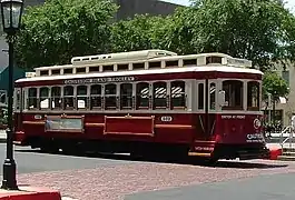 The Galveston Island Trolley is a heritage streetcar network in Galveston, Texas, United States. As of late 2006, the total network length was 6.8 miles (10.9 km) with 22 stations. The Galveston Island Trolley is operated by Island Transit. The rail system reopened in 2021, after having been out of service for 13 years following severe damage caused by Hurricane Ike in 2008. Subsequent to the 2008 closure, the Federal Emergency Management Agency (FEMA) and the Federal Transit Administration agreed to fund repairs.[1] In January 2017, a contract was approved to restore three of the trolleys at a cost of $3.8 million.[2] At that time, the trolleys were expected to be ready to return to service in 2018,[3][4] but the date was later postponed to 2019[5] and later to 2021. By November 2020, two reconditioned trolleys had returned to Galveston.[6] The line reopened for service in October 2021, limited to three days a week for now.