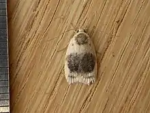 The wingspan is about 14.5โ17 mm. The forewings are pale ochreous, with a small cloudy dark purplish-fuscous semi-oval spot on the inner margin near the base and a large roundish well-defined dark purplish-fuscous blotch in the middle of the disc. Within this blotch are two rather large roundish spots of whitish blue scales mixed with blackish, each surrounded by a suffused blackish ring. Between the blotch and the apex is an outwardly-curved cloudy dark fuscous transverse line and there are two or three dark fuscous-grey scales on the hindmargin around the apex. The hindwings are dark fuscous-grey, but whitish-ochreous towards the base and costa.[1]