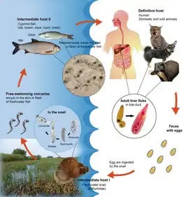 Opisthorchiasis is a parasitic infection caused by the liver fluke species, Opisthorchis viverrini and Opisthorchis felineus.[21] It primarily affects humans and other mammals that consume raw or undercooked fish infected with Opisthorchis. The transmission of opisthorchiasis occurs through the ingestion of metacercariae, the infective form of the parasite, which are present in freshwater fish, such as cyprinids and catfish. Once inside the human body, the metacercariae migrate to the bile ducts, where they develop into adult flukes. The adult flukes can cause inflammation and damage to the bile ducts and liver, leading to various symptoms.