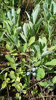 Gaylussacia nana is a shrub up to 1 m (40 inches) tall, sometimes forming large colonies of hundreds of individuals. It has dull green to yellow-green leaves up to 4 cm (1.6 inches) long. Inflorescences hang from the leaf axils or from the tips of branches, with 1-4 greenish-white flowers. Fruits are sweet and juicy, usually dark blue but sometimes white, up to 8 mm (0.3 inches) in diameter.[5][6]